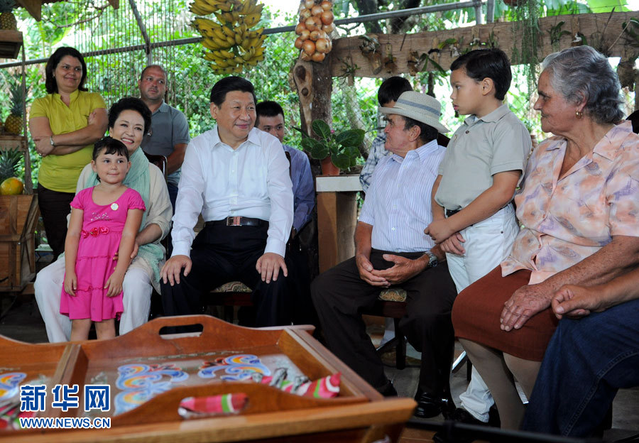 2013年6月3日,习近平和夫人彭丽媛走访哥斯达黎加埃雷迪亚省圣多明哥小镇农户萨莫拉一家,与萨莫拉一家人亲切交流。新华社记者 张铎 摄