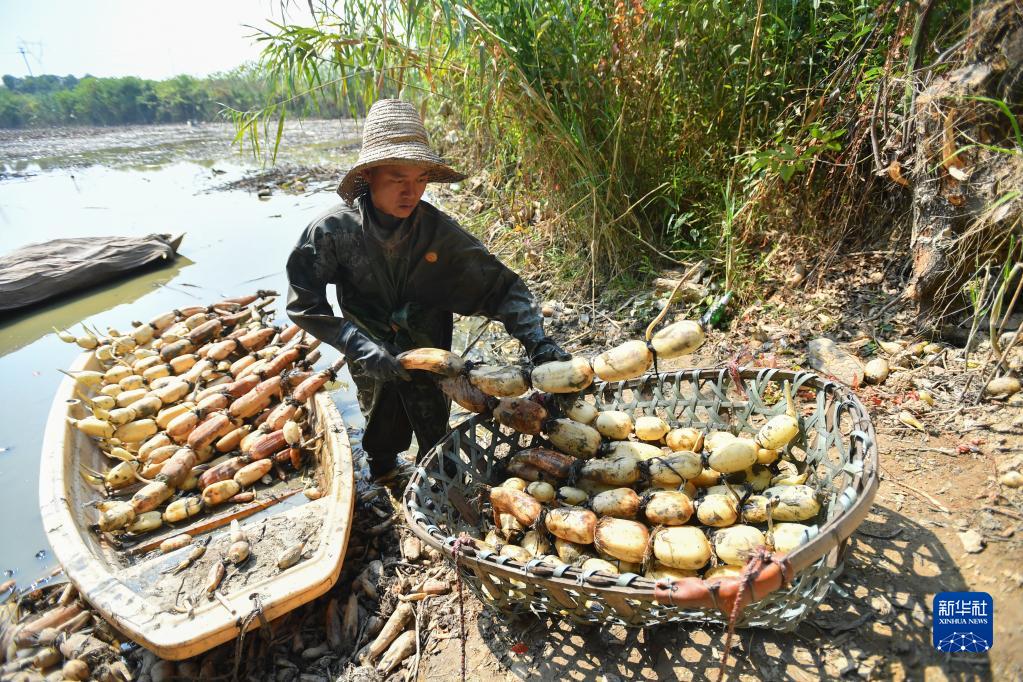 金秋时节,湖南省长沙市望城区靖港镇芦江社区种植的莲藕喜获丰收,农民紧抓农时抢收莲藕,供应市场。近年来,长沙市望城区靖港镇芦江社区依托地理环境优势,因地制宜发展莲藕产业,带动当地百姓就业增收。