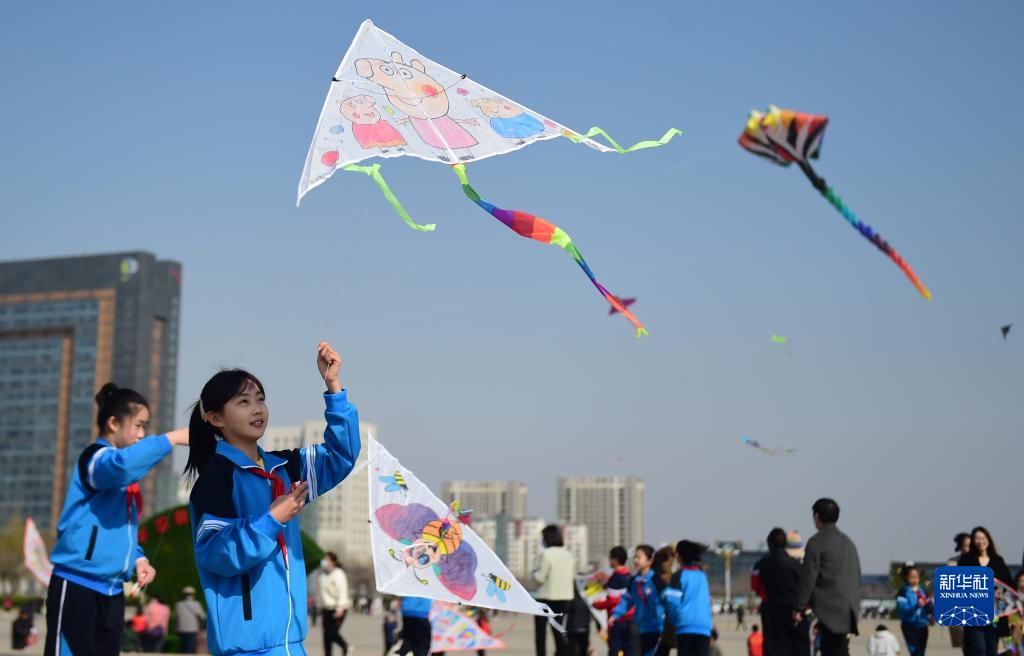 3月26日,小朋友在山东省滕州市市民广场放风筝。