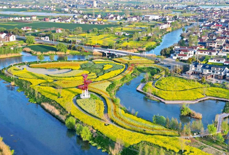 江苏省东台市梁垛镇鲤鱼岛公园春意盎然,景致宜人。蜿蜒河道环抱其间,金黄油菜花田与多彩观赏花带交织成绚丽画卷,红色观景塔错落矗立,与水乡民居、城镇天际线相映成趣