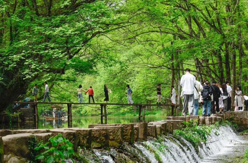安徽省黄山市徽州区西溪南湿地草木葱茏,连片枫杨林吐露新绿,丰乐河潺潺穿林而过,宛若现实版的"绿野仙踪",吸引众多游客前来游玩踏青,畅享春光