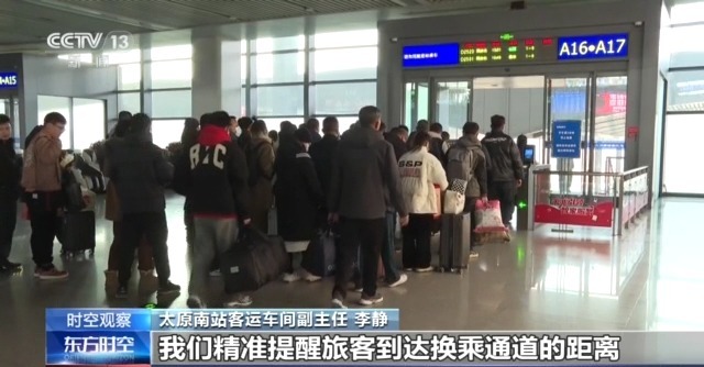 太原南站客运车间副主任李静:太原南站增加了东便捷换乘通道,目前站内有东换乘通道、西换乘通道、重点旅客以及30分钟急客换乘通道。在每个出站通道,我们精准提醒旅客到达换乘通道的距离,实现最短距离不出站换乘。