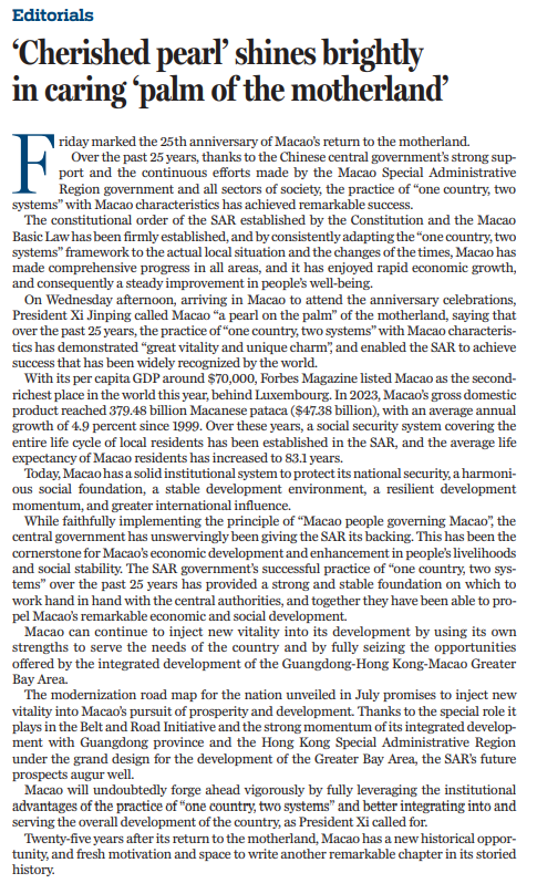 回归祖国25年来,在中央和祖国内地大力支持下,澳门特别行政区政府和社会各界接续奋斗,具有澳门特色的“一国两制”实践取得举世瞩目成就,宪法和澳门基本法确立的特别行政区宪制秩序牢固树立,澳门各项事业全面进步,经济快速发展,民生持续改善。