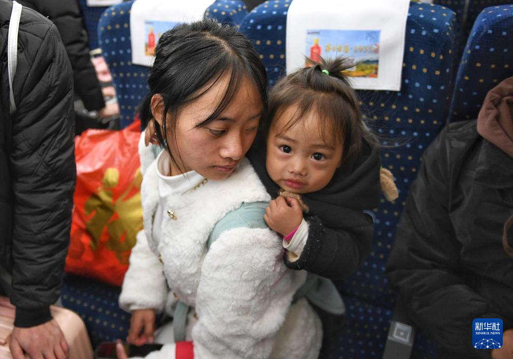 1月14日,乘客乘坐深圳北站的春运首趟动车组列车深圳北至西安北G834次出发。