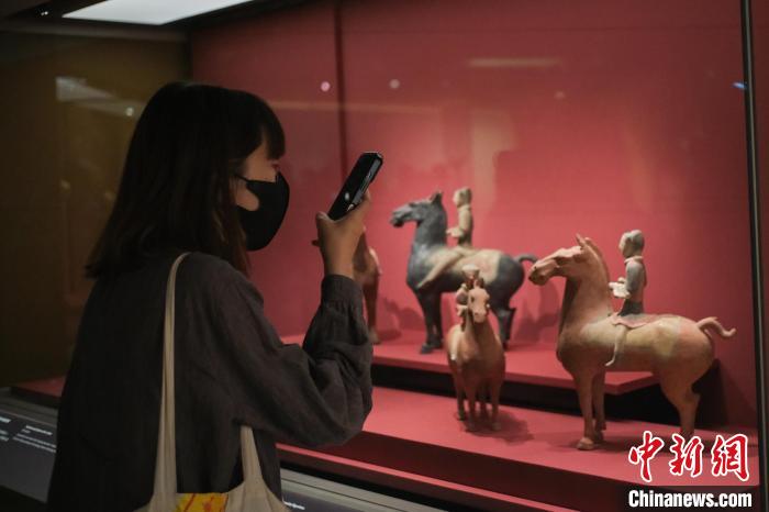 图为一名女士拍摄彩绘骑马俑。中新网记者 陈永诺 摄