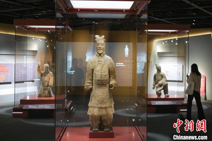 图为高级军吏俑(中)、跽姿俑(左)、跪射俑展品。中新网记者陈永诺 摄
