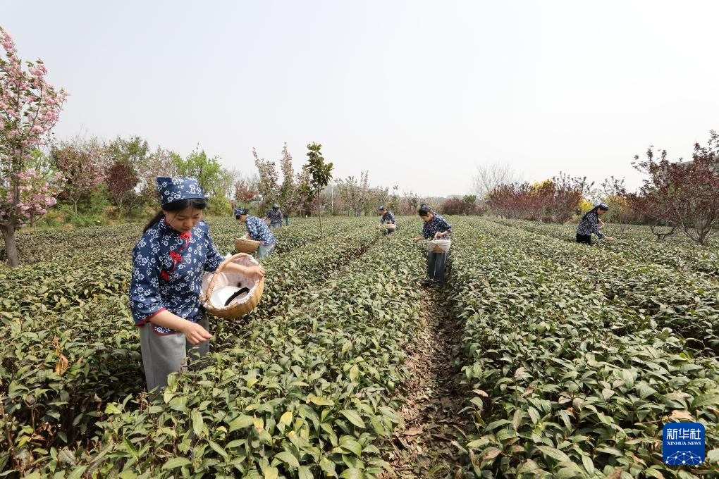 4月18日,在山东省日照市东港区后村镇蔡家官庄村,茶农在茶园里采摘春茶。