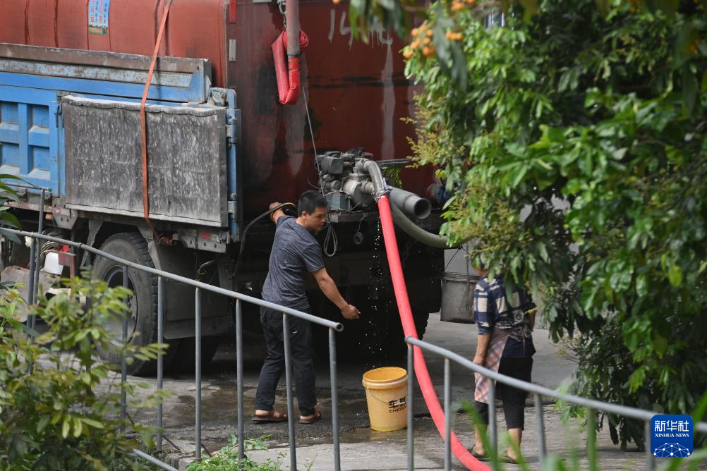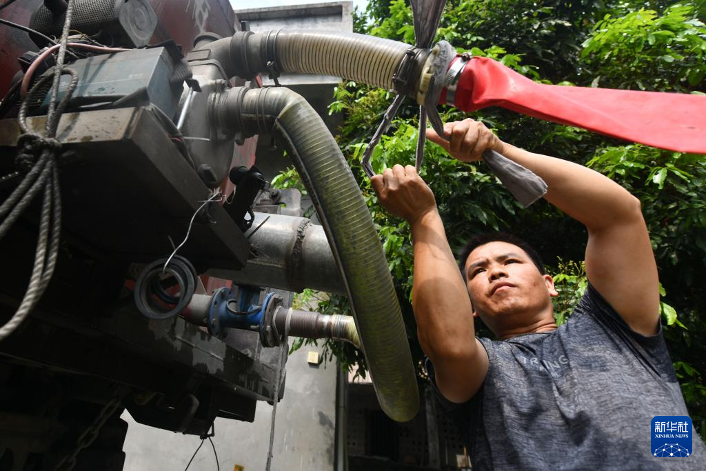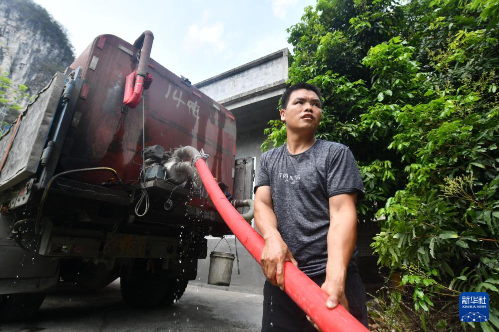 4月21日,在广西马山县里当瑶族乡北屏村,送水人员将水从运水车引入水柜。
