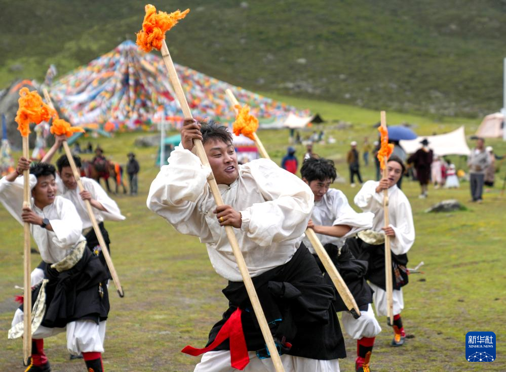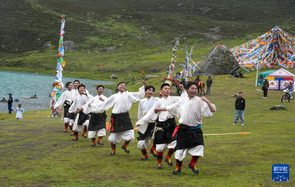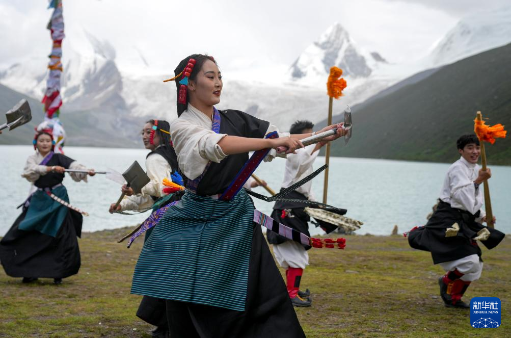 西藏那曲市比如县艺术团的演员在萨普雪山景区为游客表演国家级非物质文化遗产舞蹈“达布阿谐”(7月19日摄)。这是该艺术团今年在景区开展的第6场非遗展演活动。