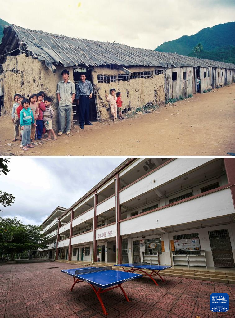 这是一张拼版照片。上图:20世纪90年代在海南保亭毛感乡拍摄的山村教学点(资料照片);下图:2025年7月22日拍摄的毛感乡中心学校(新华社记者蒲晓旭摄)。