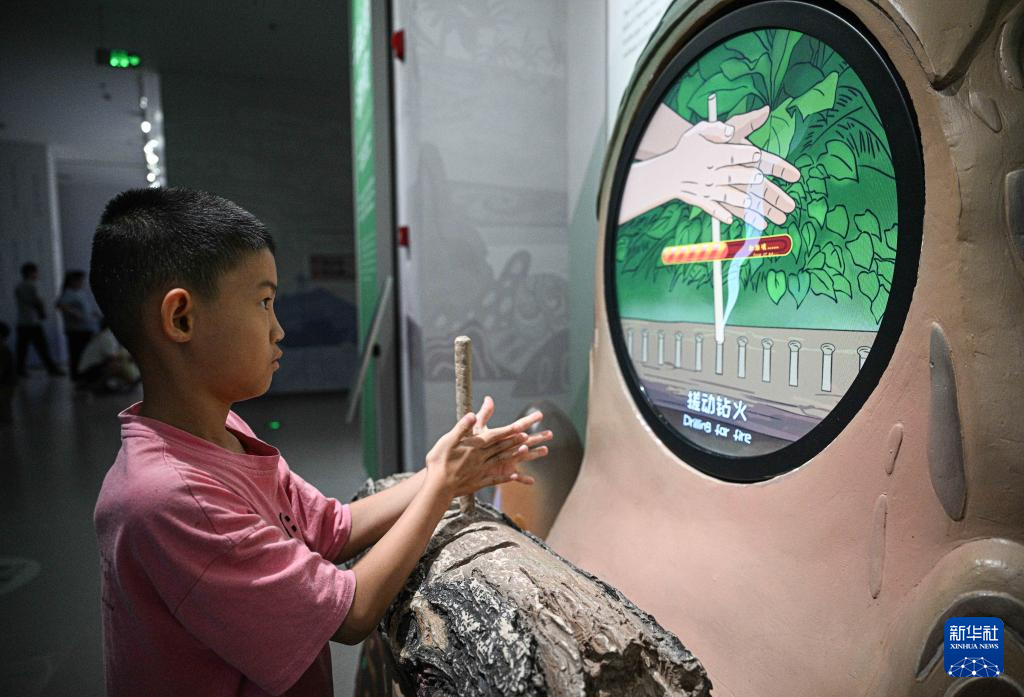 7月27日,在位于海口的海南省非遗展示中心,观众体验黎族钻木取火技艺。由海南保亭申报的黎族钻木取火技艺于2006年入选第一批国家级非物质文化遗产名录。