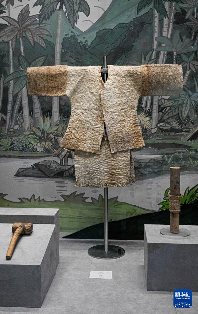 7月27日在位于海口的海南省非遗展示中心拍摄的树皮衣、树皮裤。由海南保亭申报的黎族树皮布制作技艺于2006年入选第一批国家级非物质文化遗产名录。