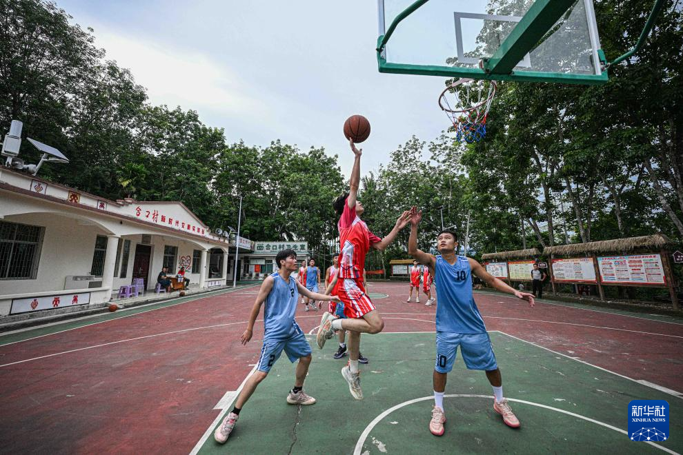 人们在海南保亭响水镇合口村进行篮球比赛(7月23日摄)。合口村是黎族村庄,于2025年5月获评“全国文明村镇”。