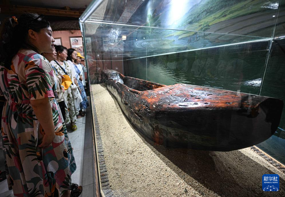 游客在位于海南保亭的槟榔谷文化旅游区观看黎族独木舟(5月15日摄)。