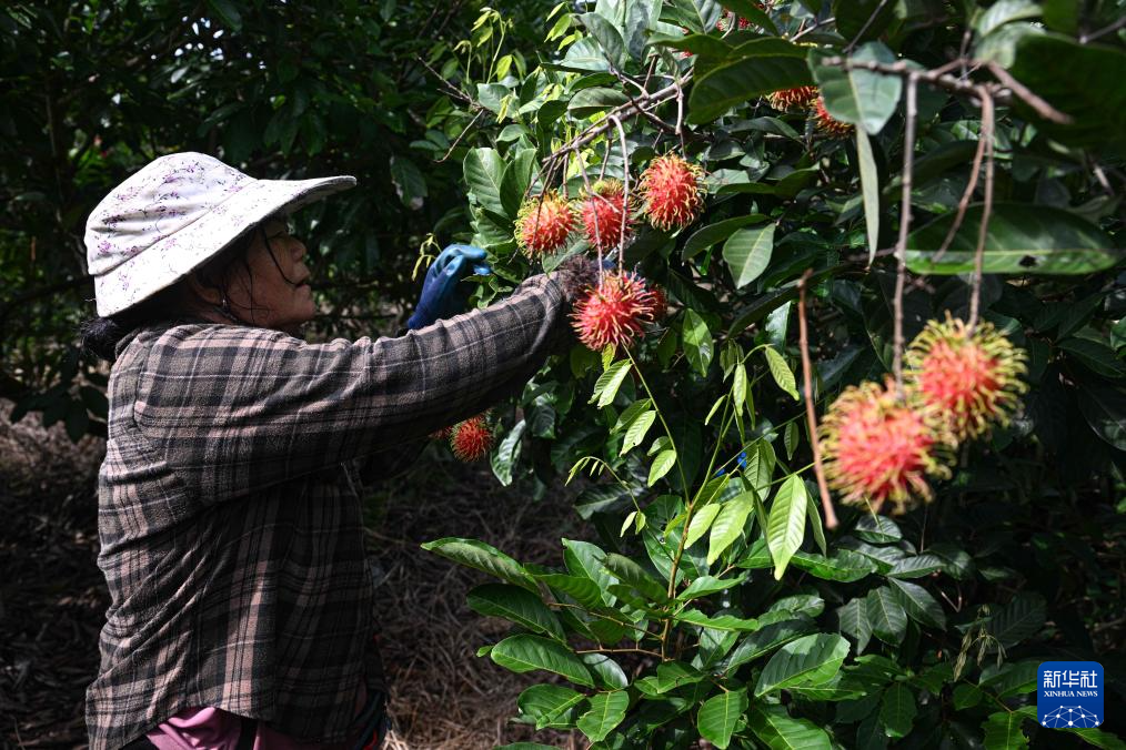 农民在海南保亭采收红毛丹(7月14日摄)。红毛丹是保亭热带特色高效农业的一张靓丽名片。