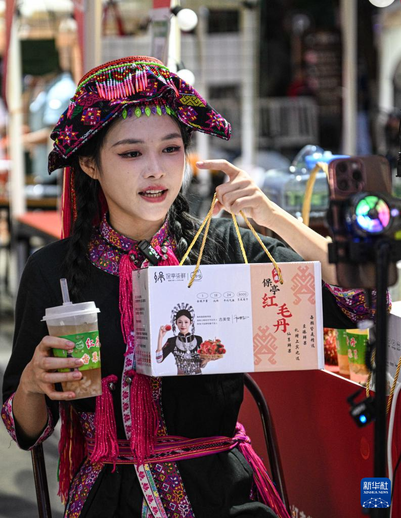 网络主播在海南保亭为保亭红毛丹进行视频直播带货(7月12日摄)。