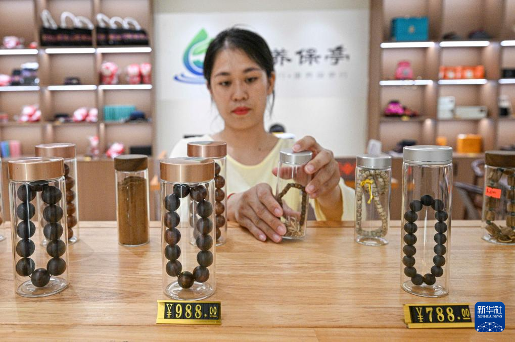 在位于海南保亭的“康养保亭”品牌体验店拍摄的沉香、黄花梨手串(7月17日摄)。保亭依托生态与气候优势大力发展康养产业。