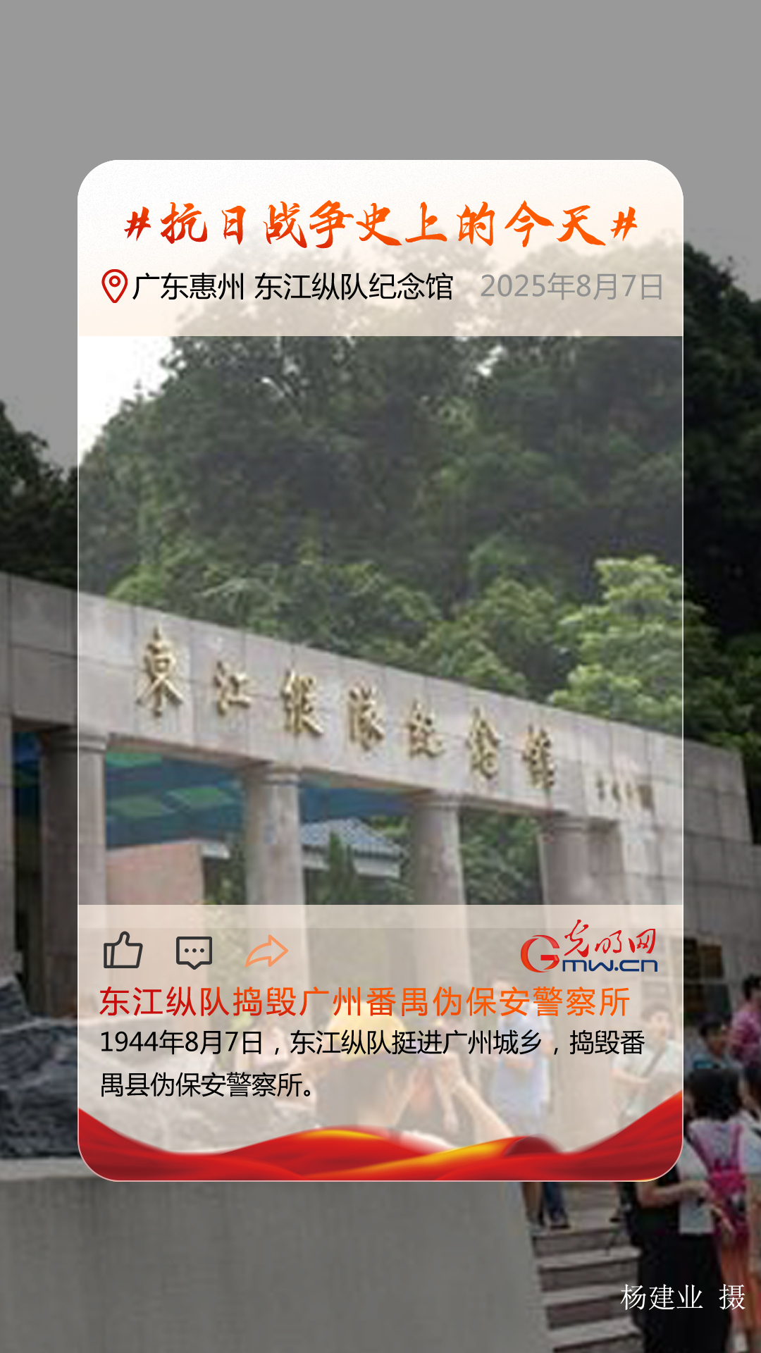 1944年8月7日 东江纵队挺进广州城乡,对敌侵占城镇和交通线展开攻击,捣毁番禺县伪保安警察所,使日伪军惊恐不安。