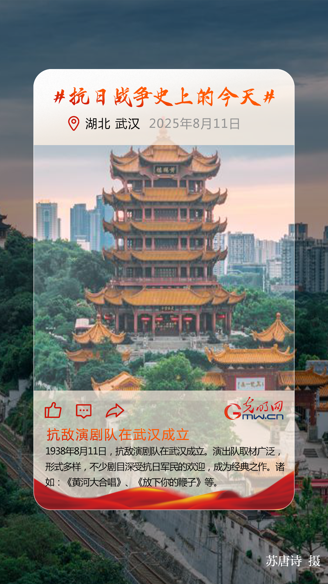 1938年8月11日,抗敌演剧队在武汉成立。在周恩来和中共长江局领导下采取各种艺术形式积极宣传党的抗日救国主张,对于鼓舞抗日军民的斗志,团结友军和坚决打击敌人发挥了重要作用。抗敌演剧队演职人员汇聚了全国各地有进步思想、有革命抱负的青年演员,诸如:瞿白音、沙蒙、吕复、赵明、石联星等,一流的剧本创作者郑君里、田汉等,优秀的领队光未然等。演出队坚持以“文艺大众化”“以广大抗战军民为对象”的原则,取材广泛,形式多样,不少剧目深受抗日军民的欢迎,成为经典之作。诸如:《黄河大合唱》、《放下你的鞭子》等。