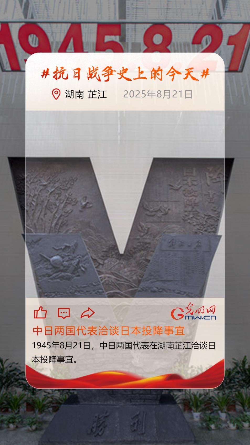1945年8月21日,中日两国代表在湖南芷江洽谈日本投降事宜。日本代表签署投降备忘录,开始了中国战区投降行动。