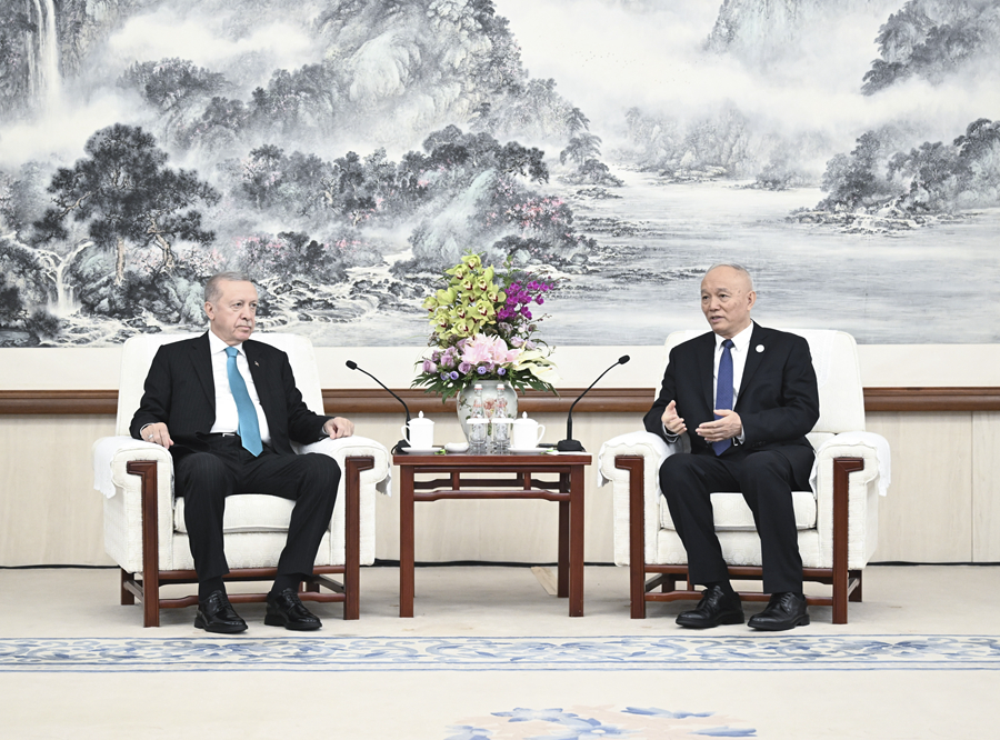 9月1日,中共中央政治局常委、中央书记处书记蔡奇在天津会见来华出席2025年上海合作组织峰会的土耳其总统埃尔多安。新华社记者燕雁 摄