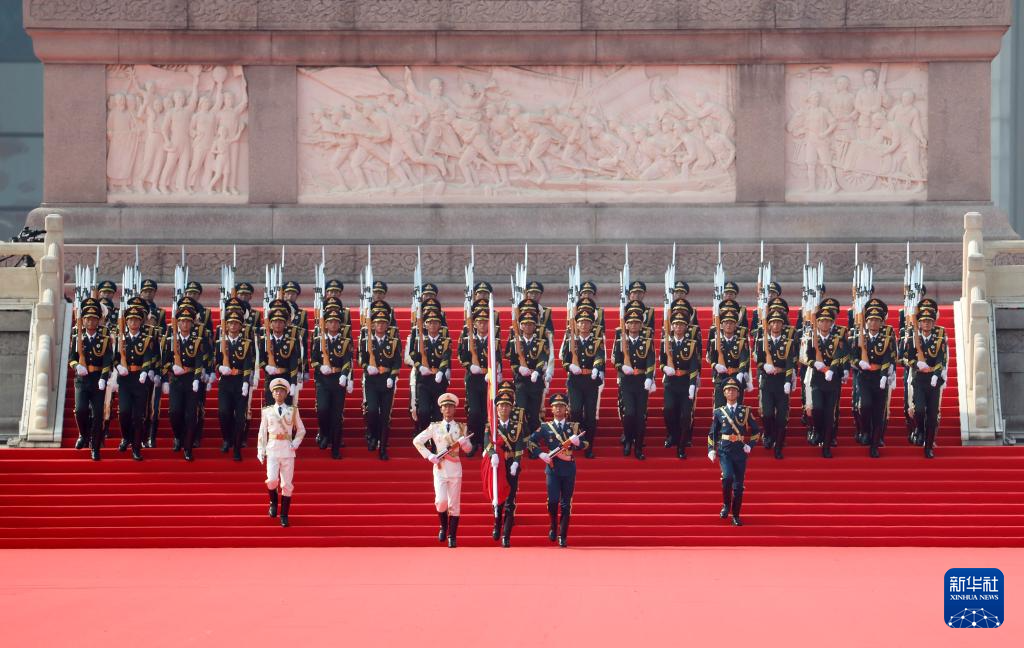 9月3日,纪念中国人民抗日战争暨世界反法西斯战争胜利80周年大会在北京天安门广场隆重举行。这是国旗护卫队从人民英雄纪念碑基座出发,走向旗杆基座。