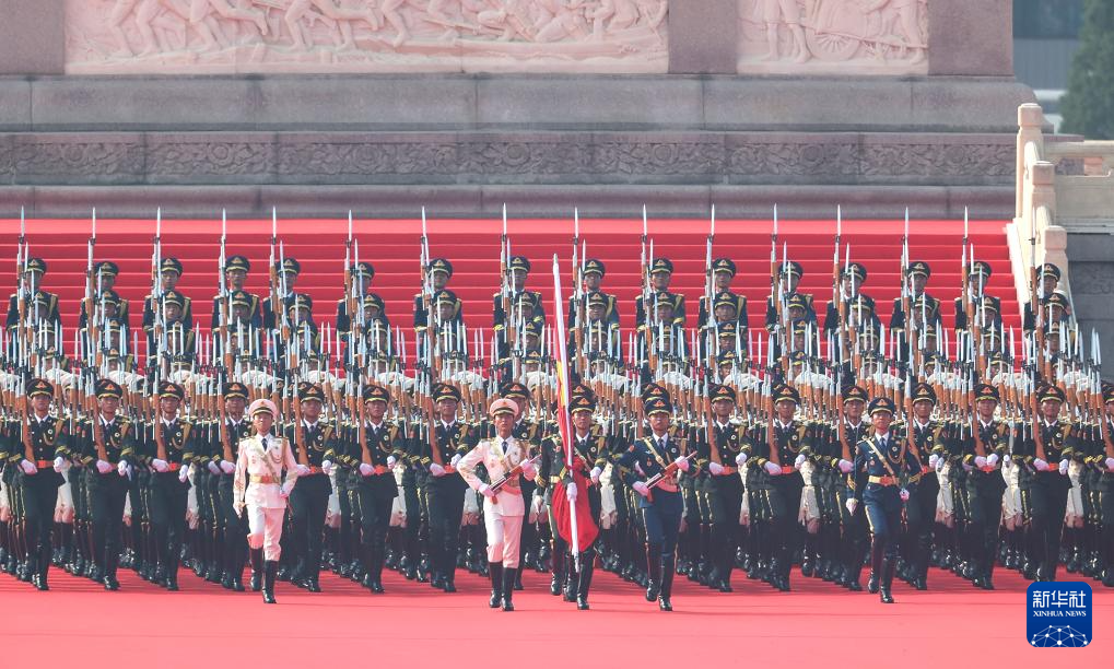 9月3日,纪念中国人民抗日战争暨世界反法西斯战争胜利80周年大会在北京隆重举行。这是国旗护卫队官兵护卫着五星红旗,从人民英雄纪念碑行进至广场北侧升旗区。