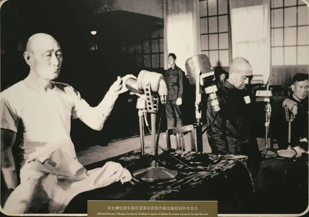 河北省遵化县东新庄受害农民张作新出庭控诉铃木启久罪行。(此照片展览于抚顺战犯管理所陈列馆)