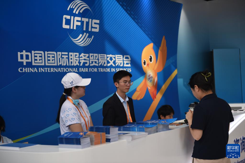 9月11日,志愿者在服贸会新闻中心服务台工作。