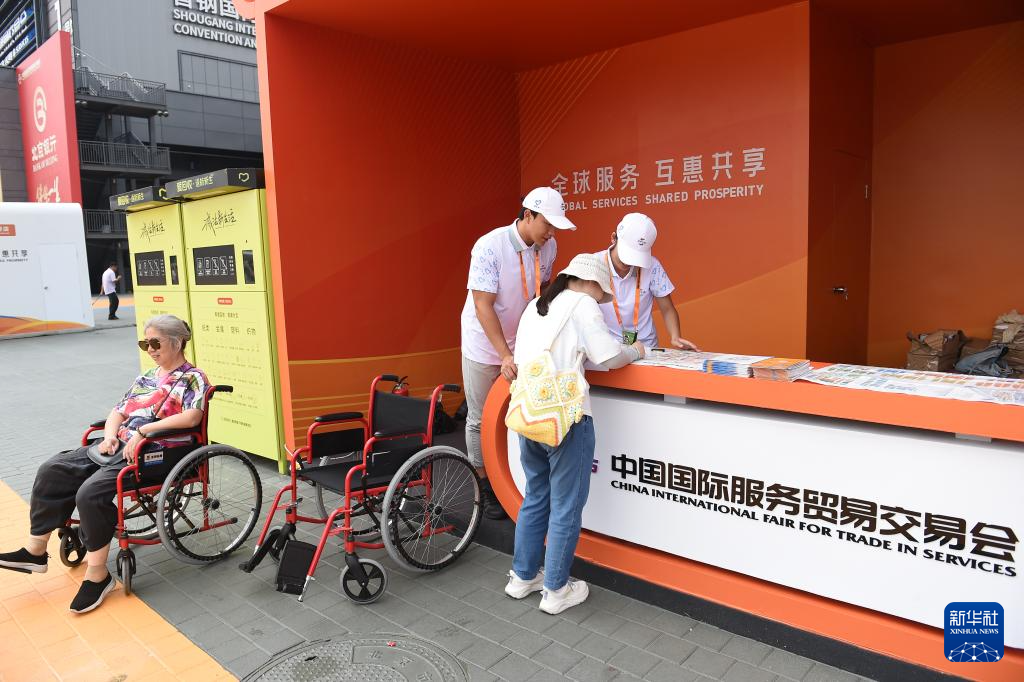 9月13日,在北京首钢园2025年服贸会现场,志愿者为参观者办理轮椅租赁手续。