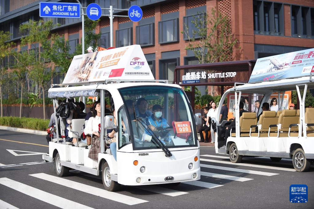 9月11日,在北京首钢园2025年服贸会现场,工作人员驾驶接驳车运送参观者。