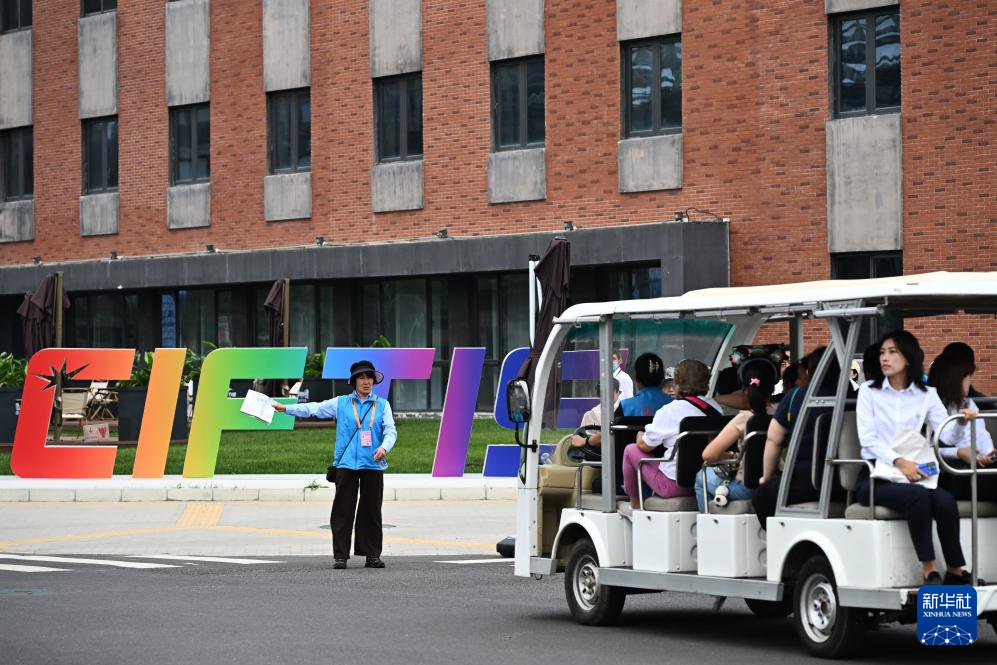 9月13日,在北京首钢园2025年服贸会现场,一名工作人员引导接驳车运送参观者。
