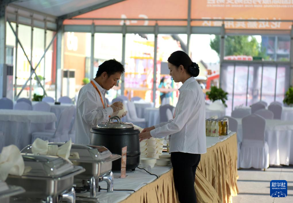 9月11日,工作人员在服贸会用餐区做准备工作。