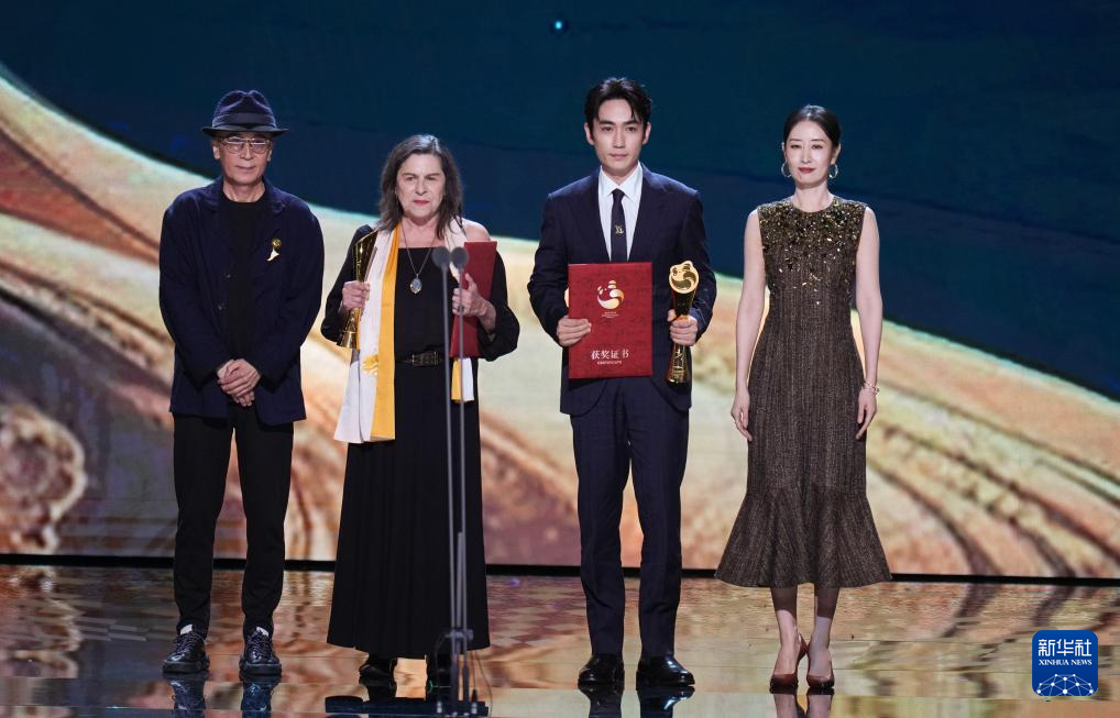 9月13日,在第二届金熊猫盛典上,电影单元最佳男主角朱一龙(右二)、最佳女主角黛丽丝 ·韦恩伯格(左二)与颁奖嘉宾曹保平(左一)、刘敏涛合影。