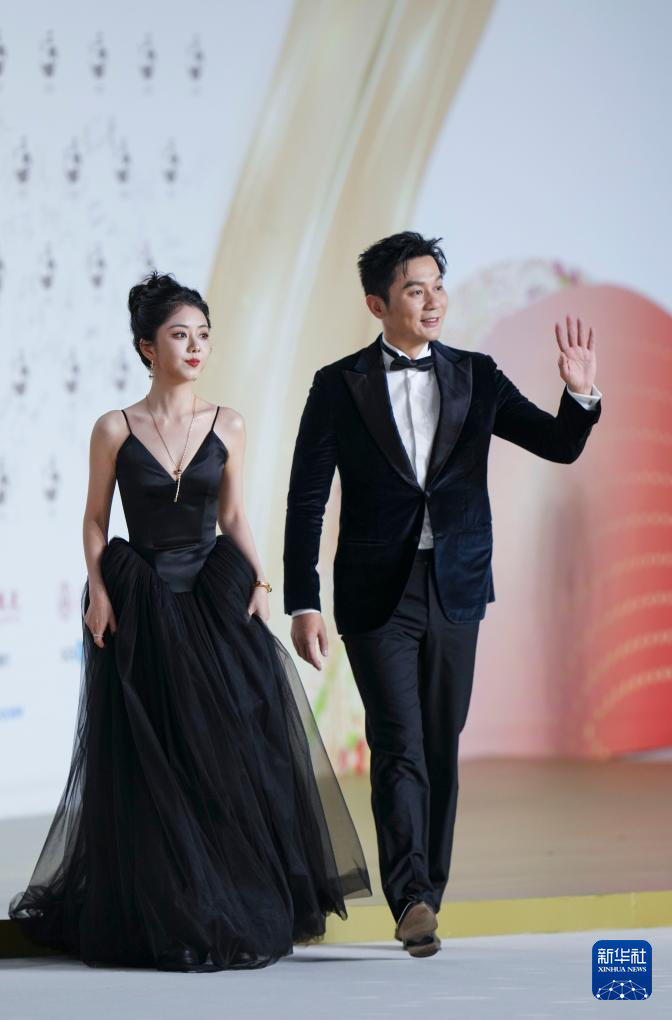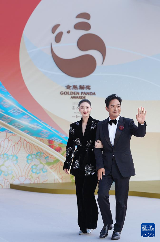 9月13日,演员蒋欣(左)和郭晓东走在第二届金熊猫盛典的“金熊猫大道”上。