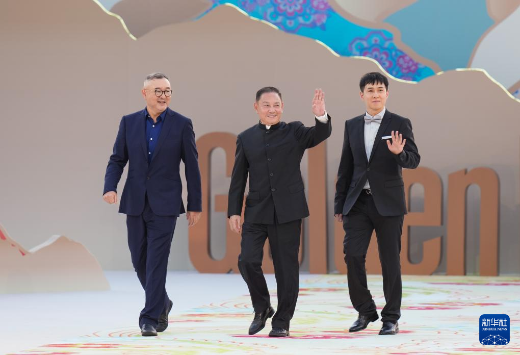 9月13日,导演宁海强(左)、演员卢奇(中)和王梓源走在第二届金熊猫盛典的“金熊猫大道”上。