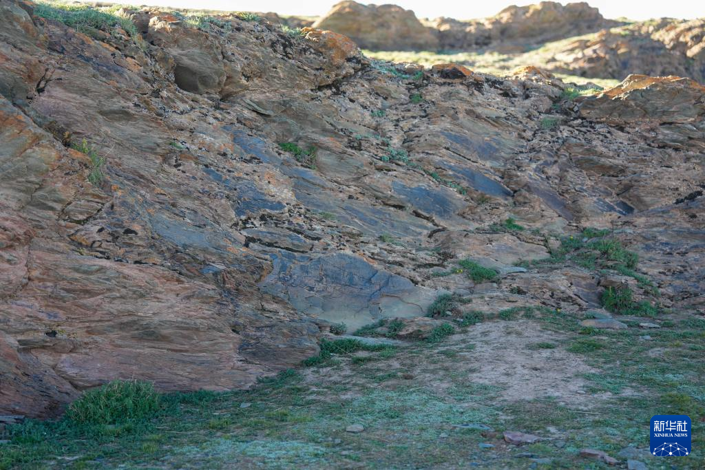 文物考古工作者于2023年7月在青海省玛多县扎陵湖畔对尕日塘秦刻石进行现场考察时拍摄的该刻石遗迹照片。