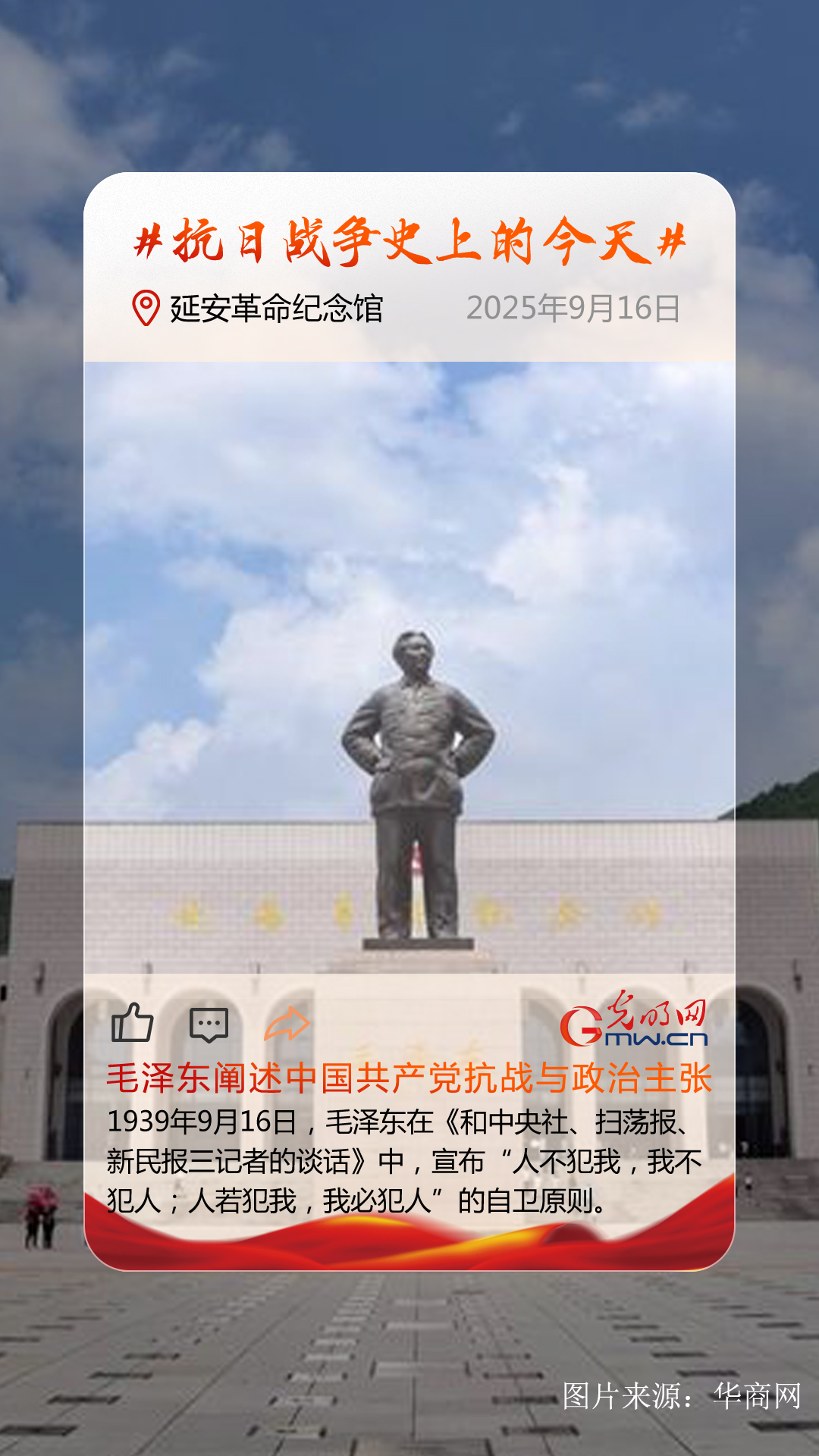 1939年9月16日,毛泽东在《和中央社、扫荡报、新民报三记者的谈话》中,阐述了中国共产党的抗战与政治主张,对国民党顽固派向解放区的军事进攻提出警告,宣布“人不犯我,我不犯人;人若犯我,我必犯人”的自卫原则。