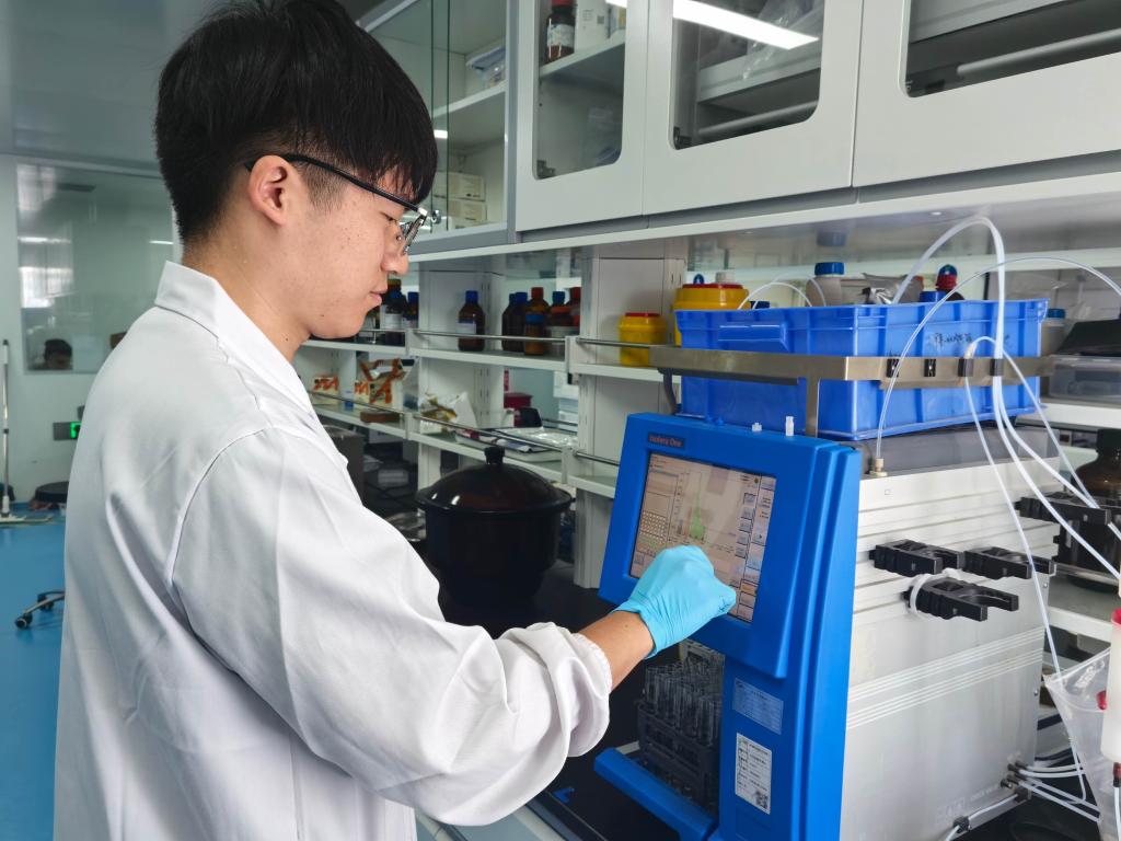 合源生物科技(天津)有限公司工作人员在生产基地的检测室进行检测。新华社记者 赵子硕 摄