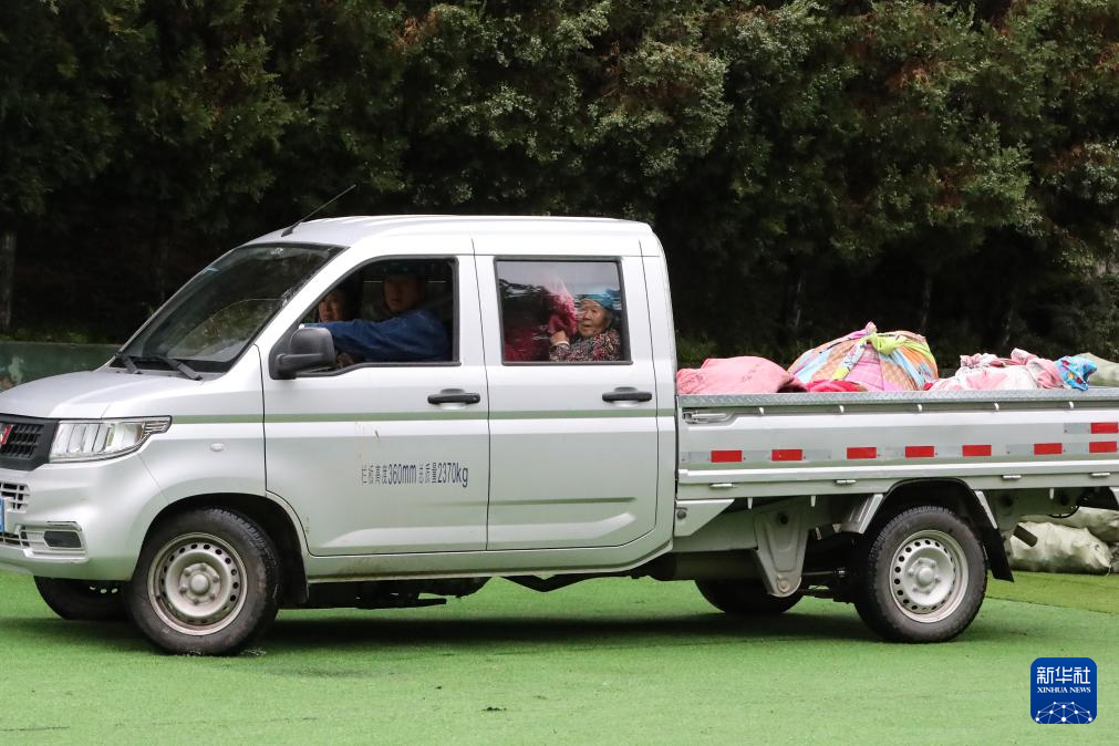 9月28日,在定西市漳县木林小学安置点,一辆转移受灾群众的车辆驶入操场。