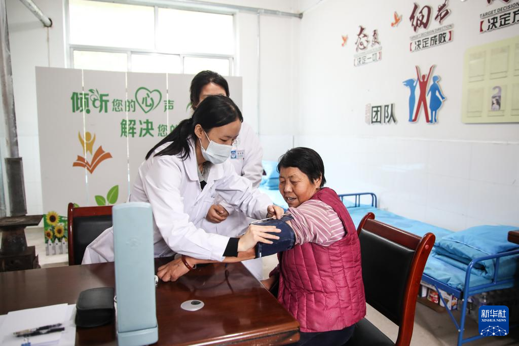9月28日,在定西市漳县木林小学安置点医疗点,医护人员为受灾群众量血压。