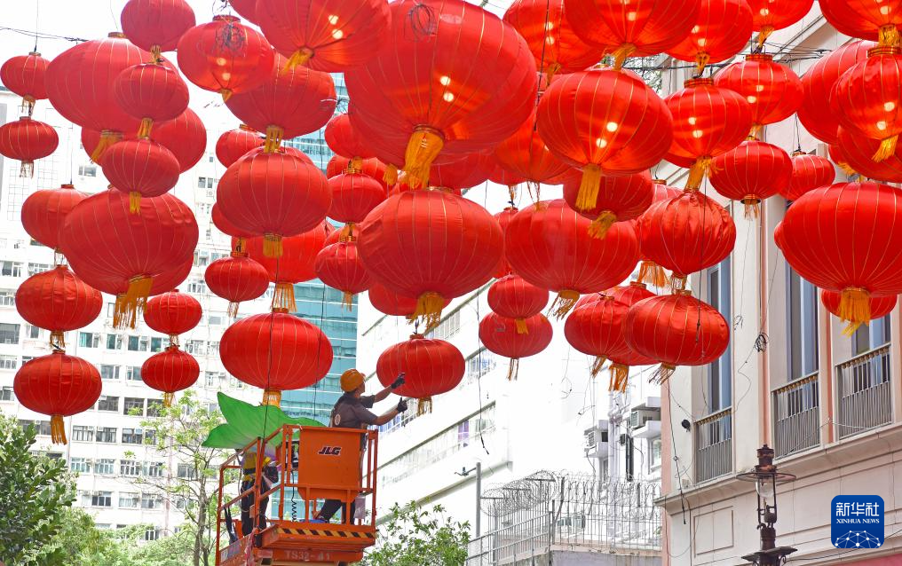 9月28日,工作人员在香港利东街悬挂大红灯笼。