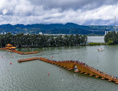 2025年1月20日,江西省赣州市章贡区城市中央公园内,游船与湖水、植被、高楼相互映衬,呈现出一幅冬日多彩美丽生态画卷