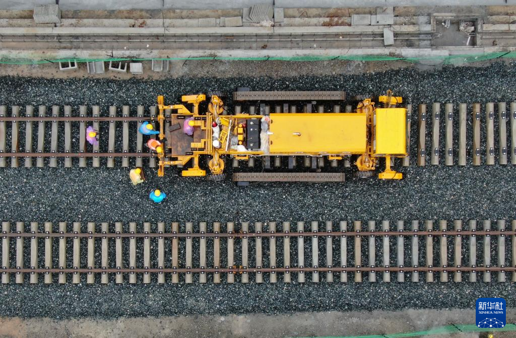 10月11日,中铁一局施工人员在西康高铁西安东站至牛背梁站区间铺设无缝钢轨(无人机照片)。