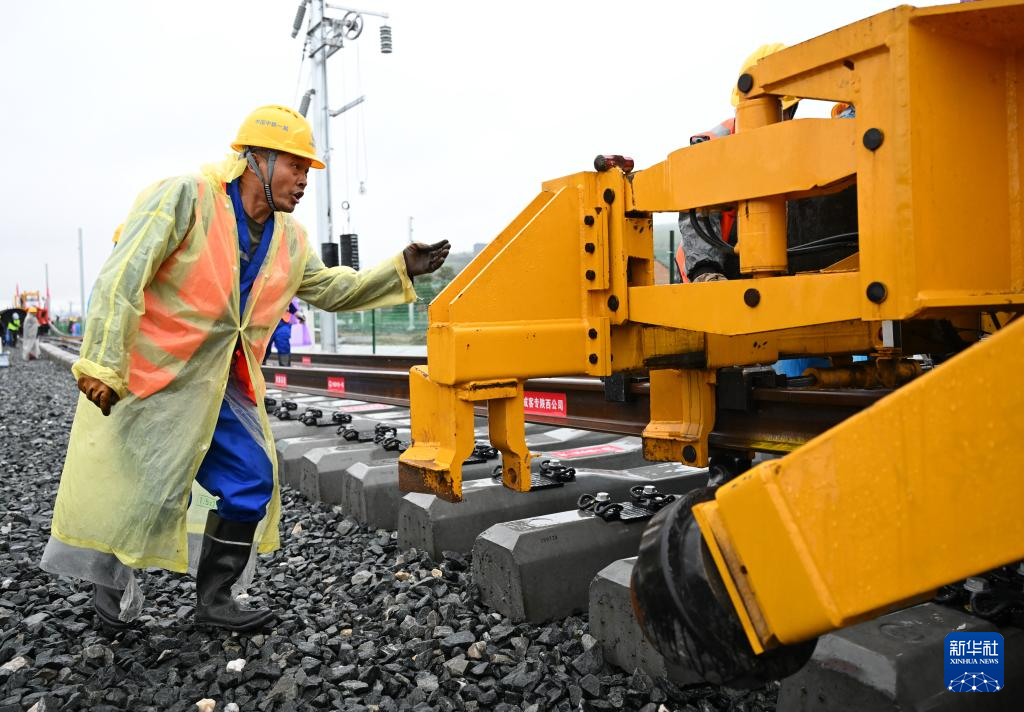 10月11日,中铁一局施工人员在西康高铁西安东站至牛背梁站区间铺轨现场作业。