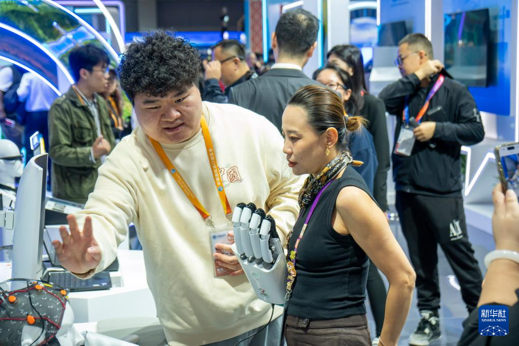 11月5日,观众在第八届进博会国家展中国馆了解非侵入式脑机接口机器人。