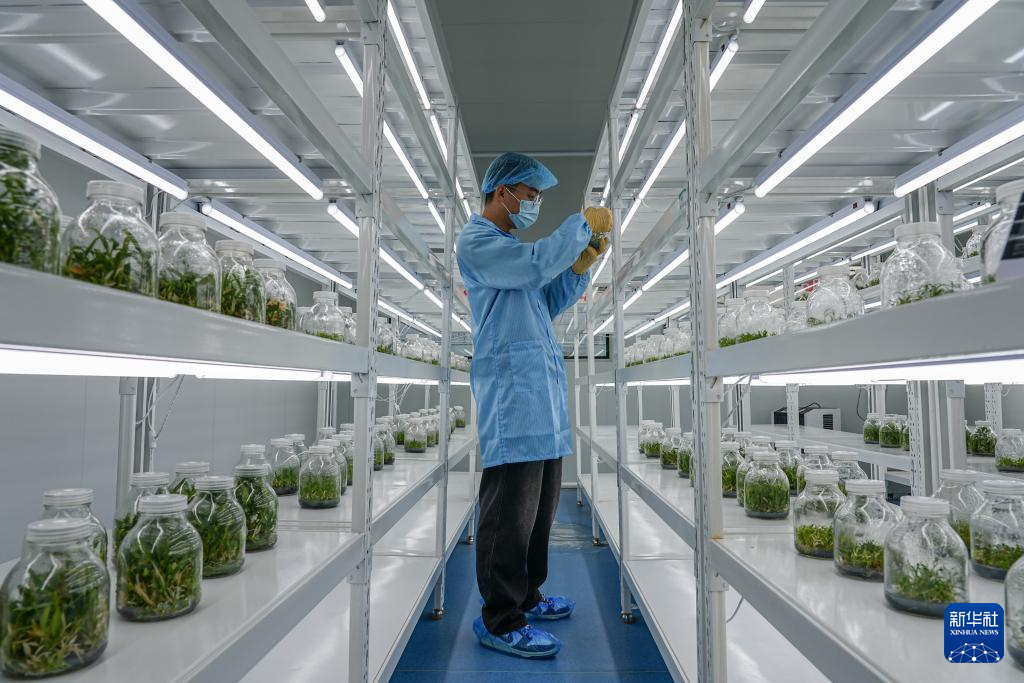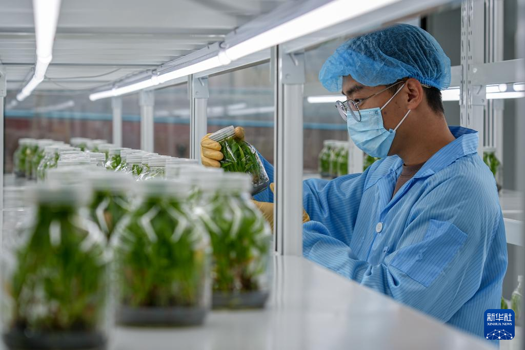 11月7日,农技人员在双泉庄村中草药脱毒组培苗繁育实验室内观察石斛秧苗。