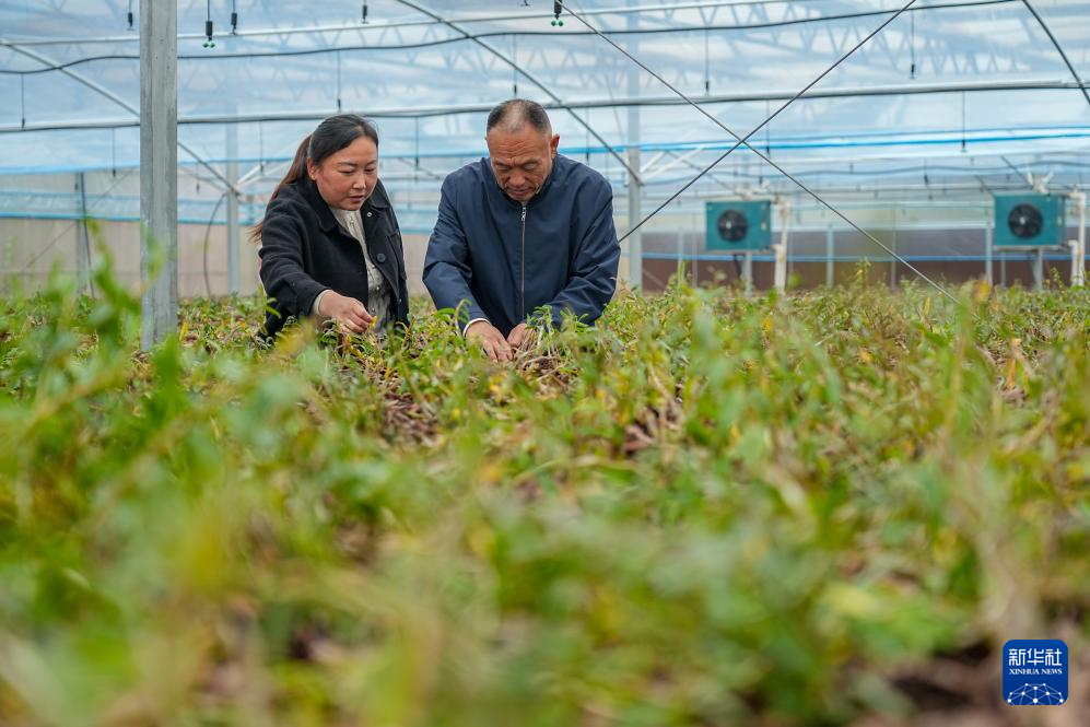 11月7日,双泉庄村党支部书记王庆柱(右)在查看石斛生长情况。