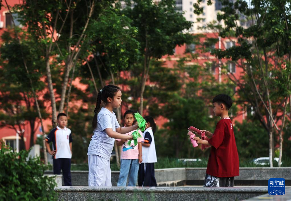 在辽宁盘锦,金书瑶(前左)放学后和朋友一起打快板(6月11日摄)。
