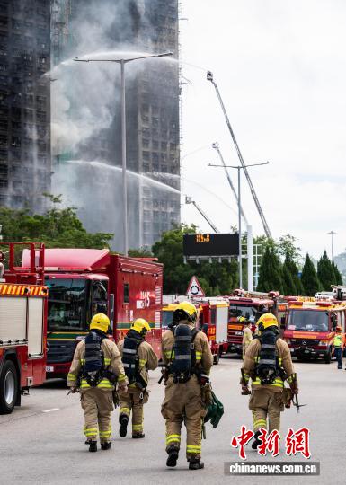 11月27日上午,消防人员持续在香港大埔宏福苑火灾现场进行救援工作。目前,部分楼宇火势得到控制。图为增援和轮替的消防员进出火灾现场。 中新社记者侯宇 摄